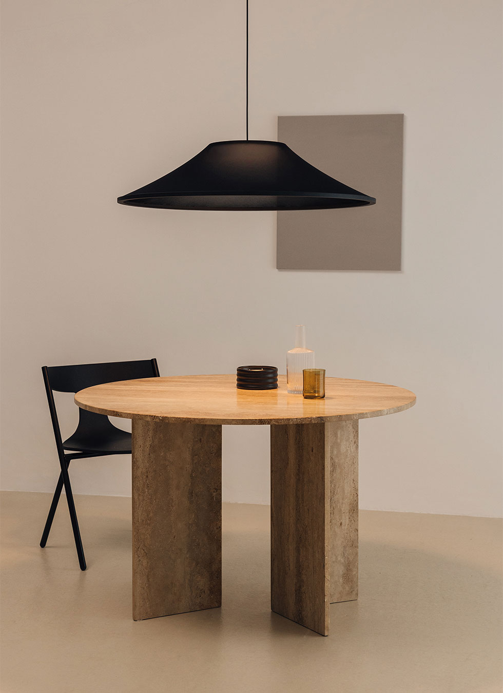 Diseñada desde una circunferencia en plano horizontal y tomar forma con auténtica fluidez gracias a su material textil, que ofrece un efecto tamizado en la luz ofreciendo gran ligereza visual.
