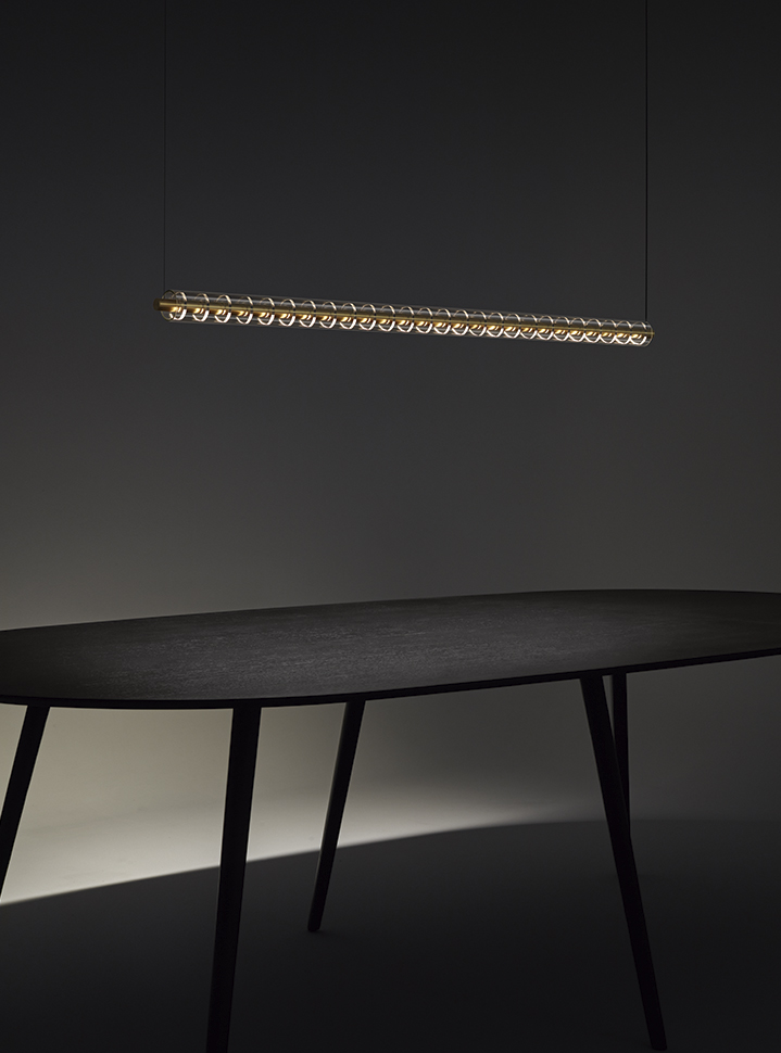 Arriesgada y fantasiosa, Loop clama a la lírica de lo industrial con un diseño inspirado en los clásicos aisladores de vidrio de las líneas eléctricas. Su carácter protagonista en lo decorativo convive con su función técnica como caudalosa fuente de luz proyectada, controlada y homogénea sobre el plano inferior o superior.