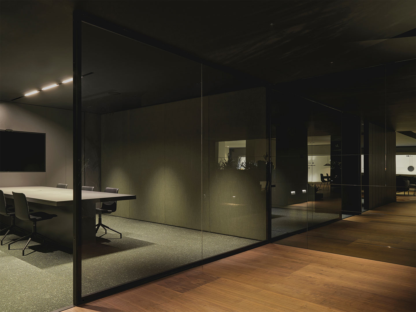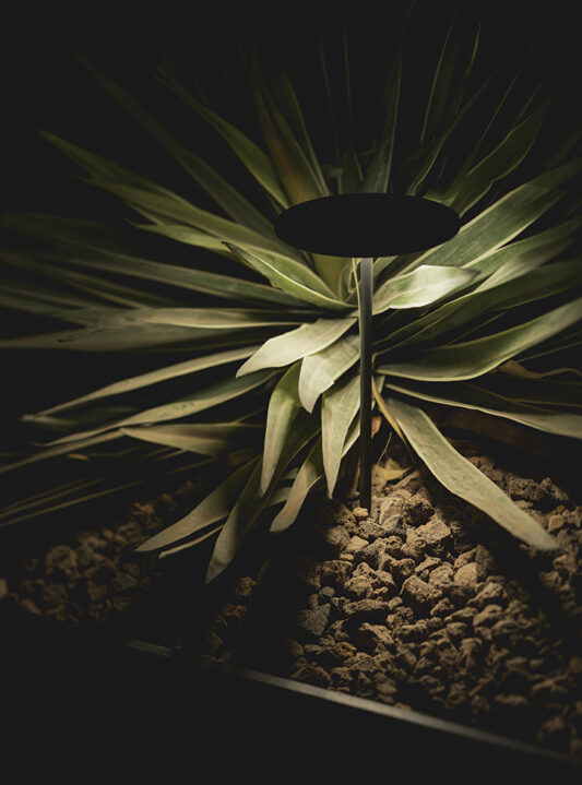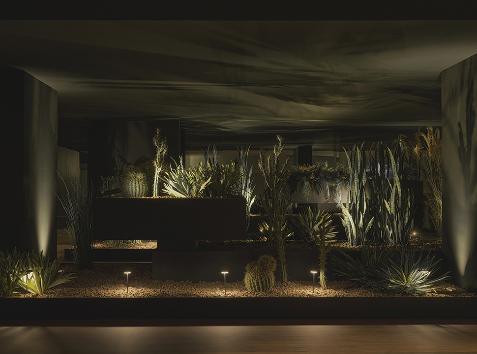 La vegetación y el espejo ahumado actúan como elementos unificadores, recrean escenas para presentar la línea de exteriores y aportan un enfoque en la luz como material constructivo que genera bienestar y emoción.