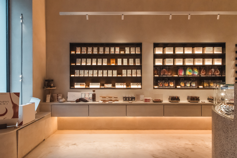 El diseño gira en torno al producto. El mueble expositor central, realizado en microcemento con virutas del propio cacao, organiza el flujo del espacio y presenta las colecciones como piezas únicas.
