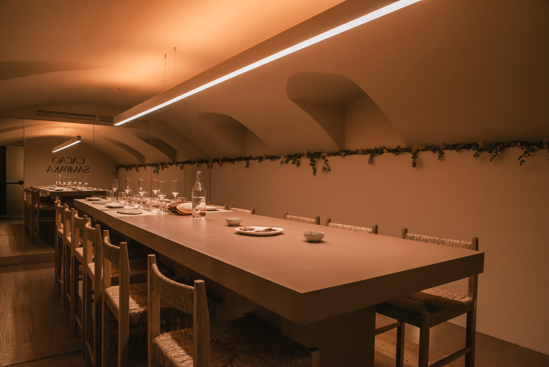 La planta sótano, destinada a talleres, catas y eventos, crea mediante una iluminación cuidadosamente estudiada, una atmósfera cálida e inmersiva que amplifica la experiencia sensorial del visitante.