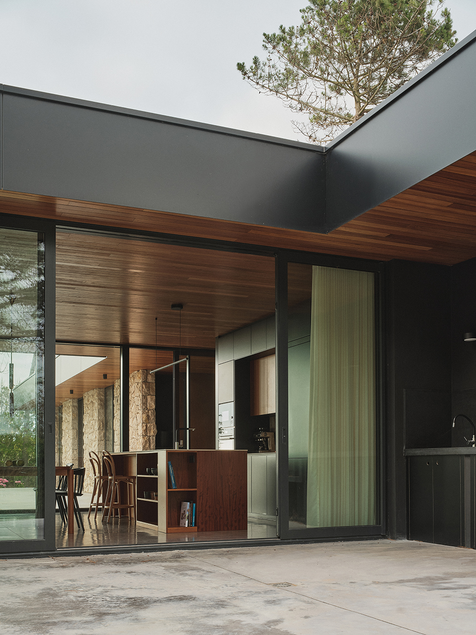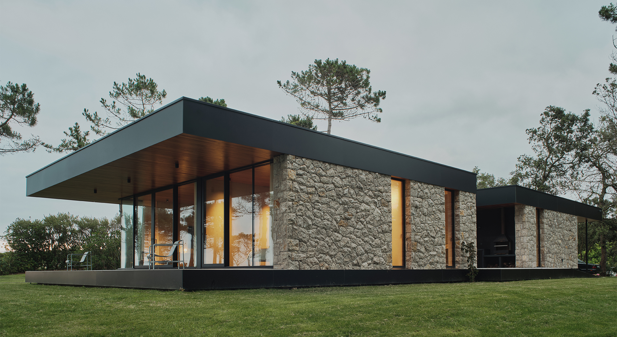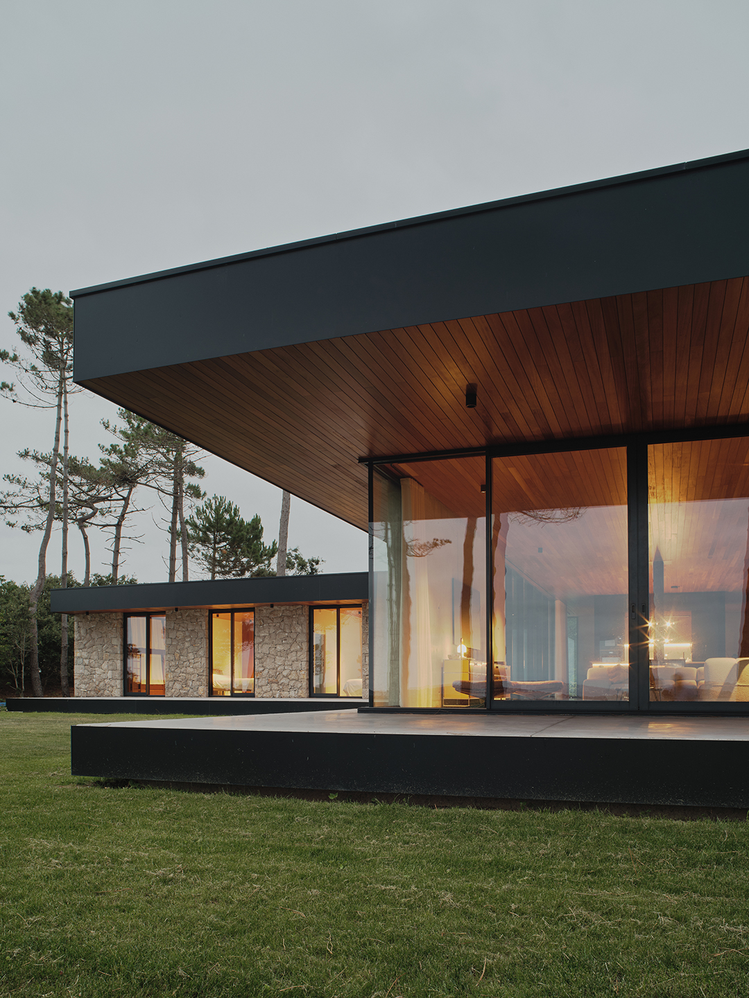 La arquitectura se define mediante un volumen rotundo y una geometría sencilla, con claras referencias al lenguaje moderno de Mies van der Rohe. El uso de materiales nobles —mampostería de piedra caliza, madera en techos y aluminio negro— genera un conjunto equilibrado, sobrio y en diálogo con la tradición vernácula renovada del Cantábrico. Las luminarias Shot Light M Surface de Arkoslight se integran a la perfección, aportando iluminación técnica sin alterar la pureza del diseño interior.