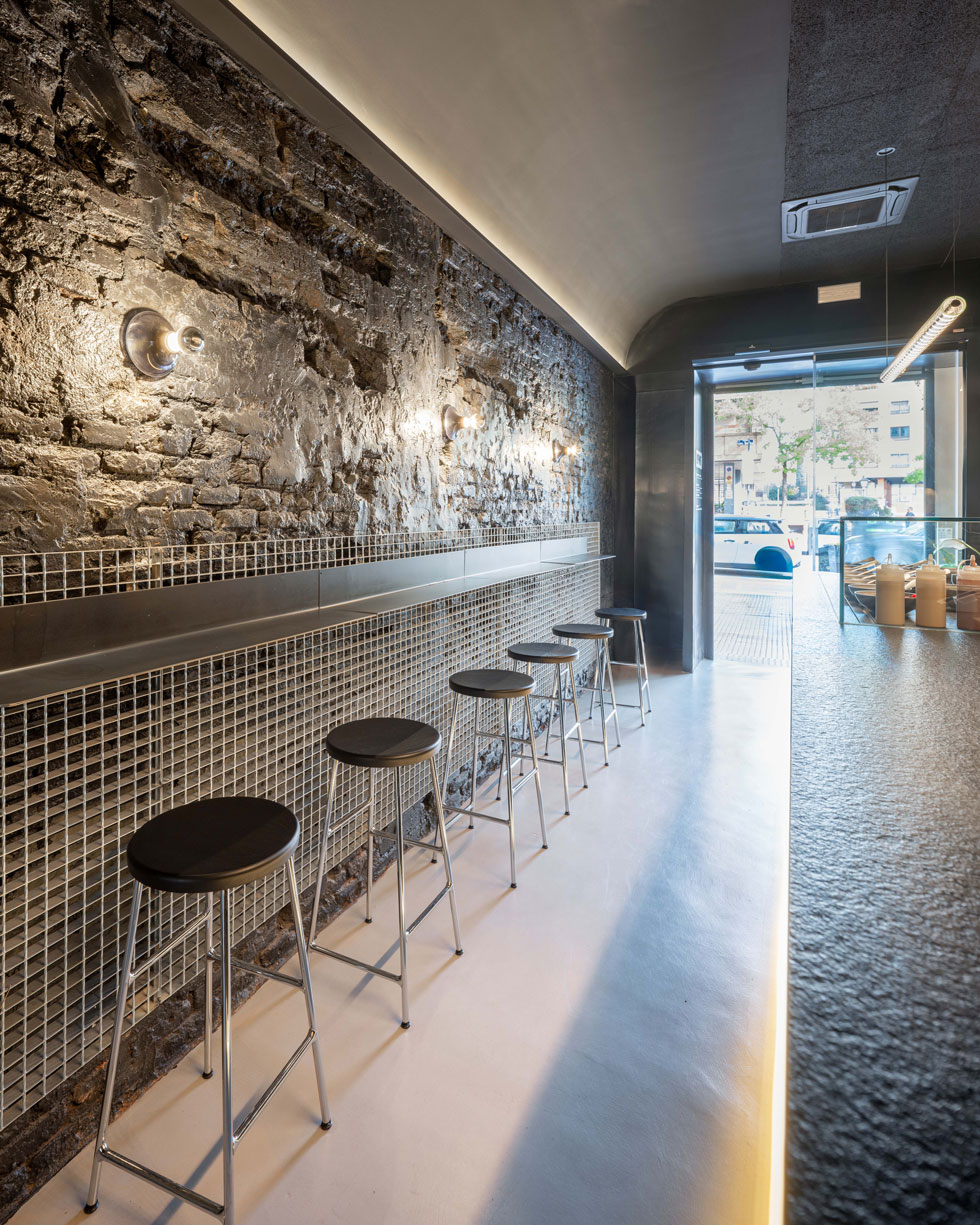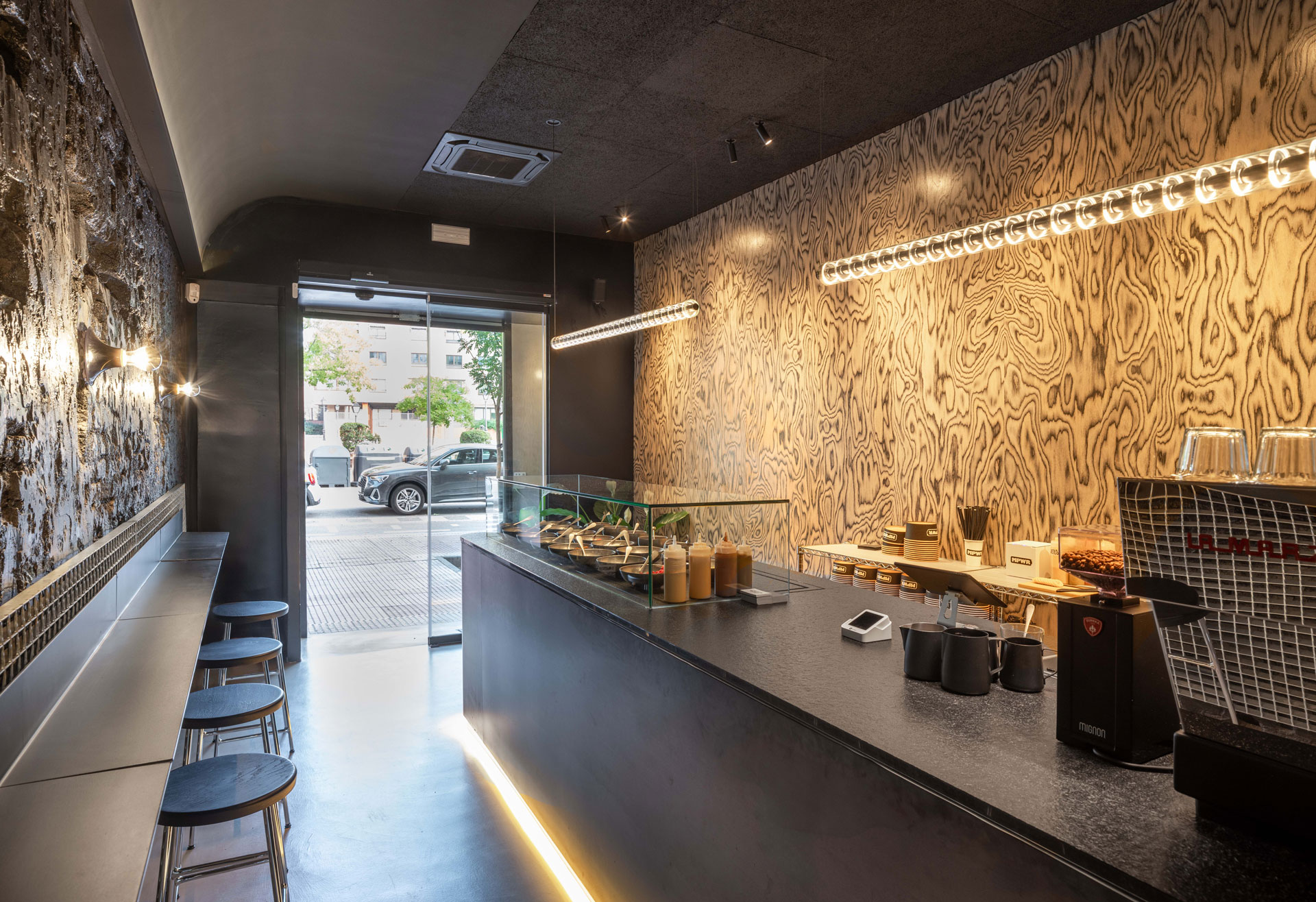 El frente, sobrio y contemporáneo, deja entrever —sin revelar por completo— el juego de contrastes que define el interior. Al entrar, la atención se dirige a una barra iluminada cuyo diseño resalta la calidez de la madera y la precisión en los detalles lumínicos. Acompañada por una pared revestida con diferentes texturas y tonos, el espacio consigue un equilibrio entre sofisticación y funcionalidad.